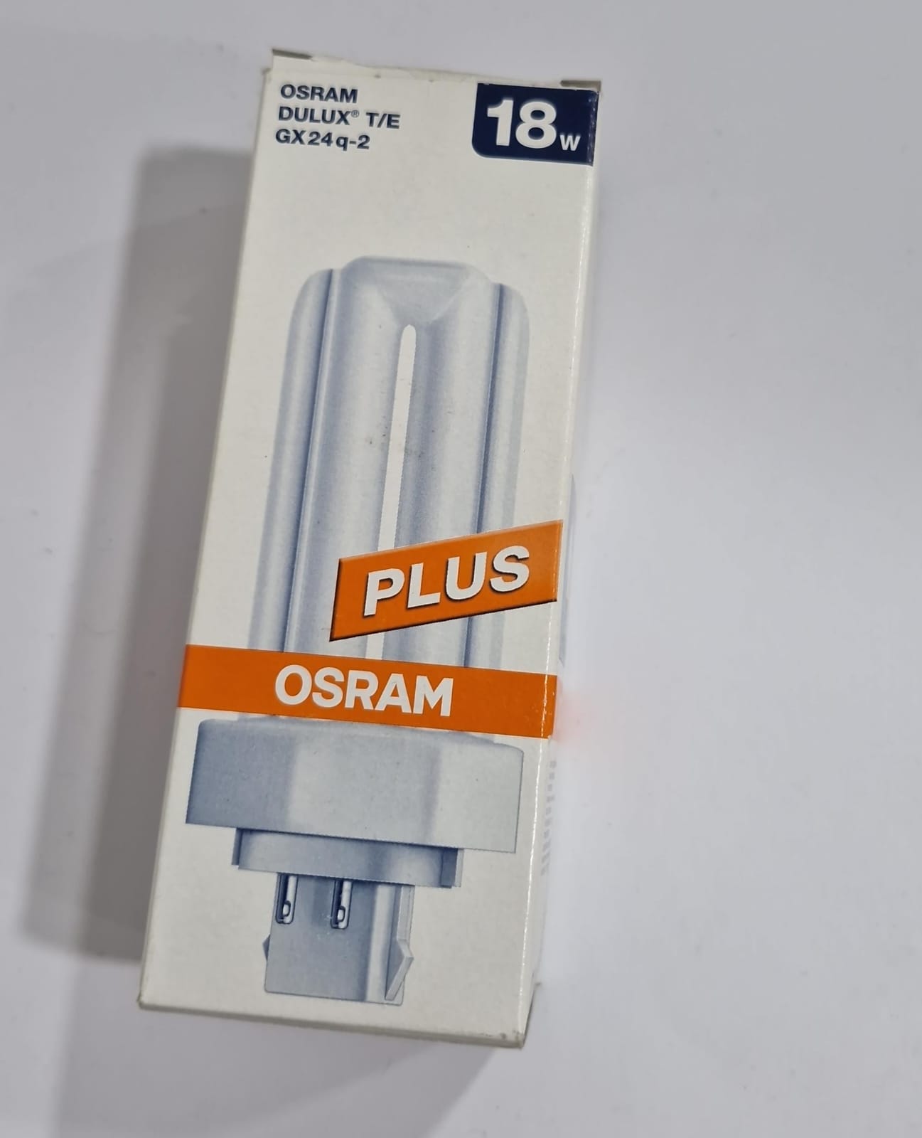Lote de 7 lámparas Osram Dulux T/E 18 W/830 Plus, con luz cálida 3000 K, casquillo de 4‑pines. Estas lámparas de bajo consumo ofrecen un flujo luminoso aproximado de 1200 lm y una vida útil nominal de 20 000 h.