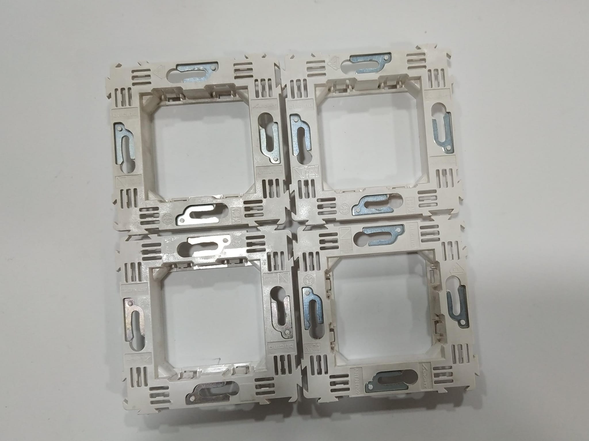 Lote de 4 soportes de módulos BTicino N4702 en blanco para fijar mecanismos eléctricos de forma estable y ordenada.